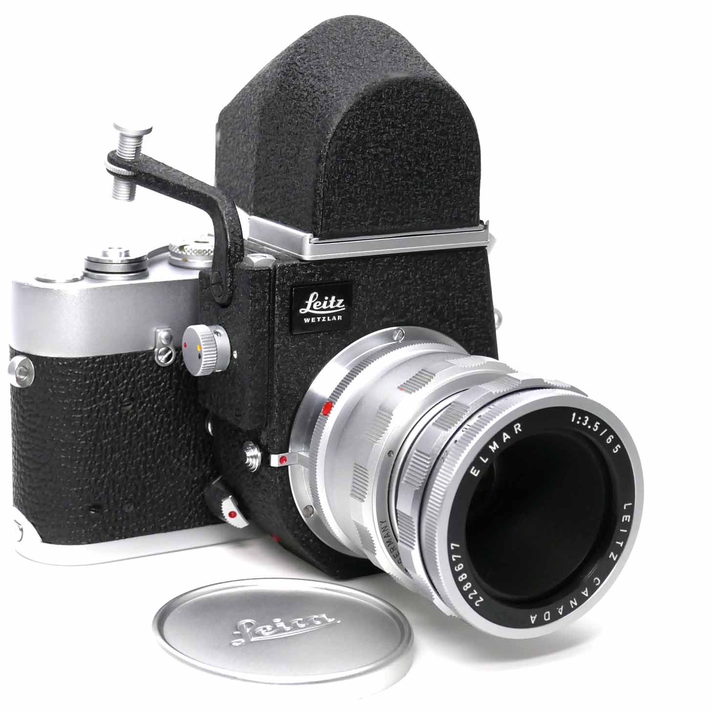 Mit Hilfe des Visoflex III kombiniert mit der Leica Universaleinstellschnecke und dem Leica Elmar 3.5/65mm können sie die Leica MDa wie eine Spiegelreflexkamera mit einer Distanzeinstellung bis unendlich verwenden.