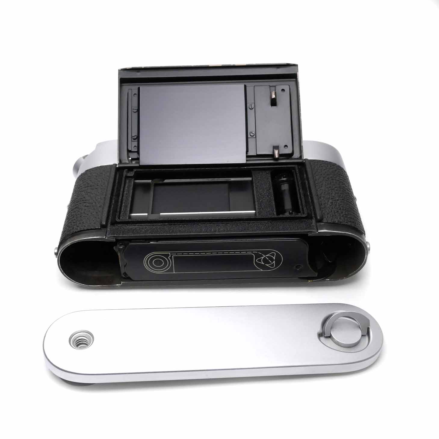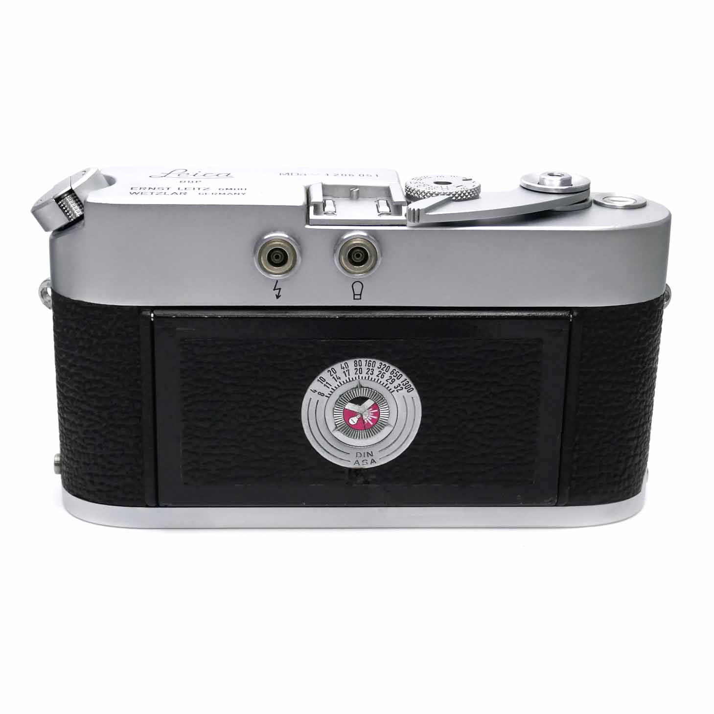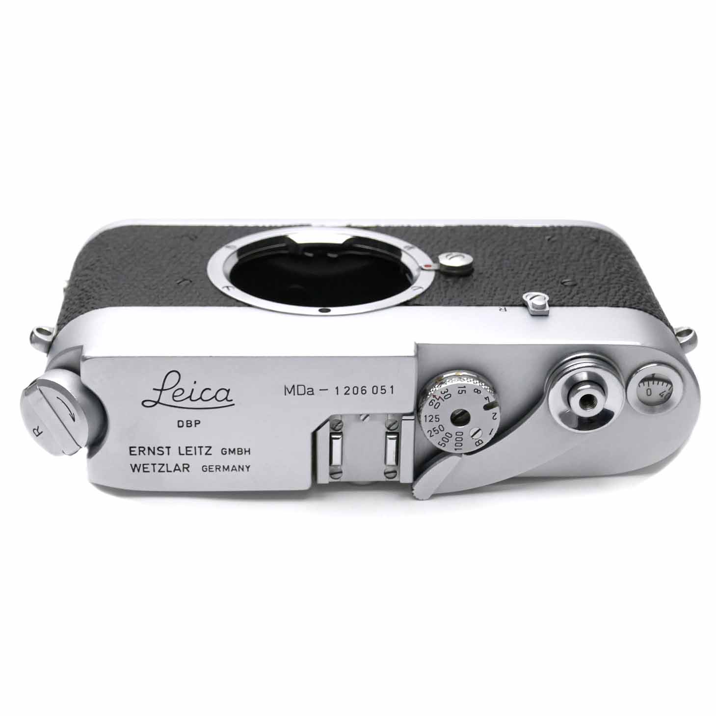 -Die Leica MDa (10103) mit der Seriennummer 1206051 wurde im Oktober 2025 revidiert. Diese Kamera wurde 1969 hergestellt. Es gibt nur wenig Abrieb auf der Deckkappe, dem Kameraboden und den Tragriemenösen. Die Belederung ist vollständig. Alle Verschlusszeiten laufen einwandfrei und sind nach der Revision präzise. Das Bajonett und die Andruckplatte haben nur wenig Abnützung.