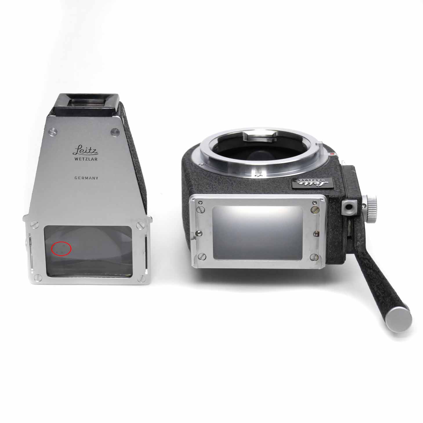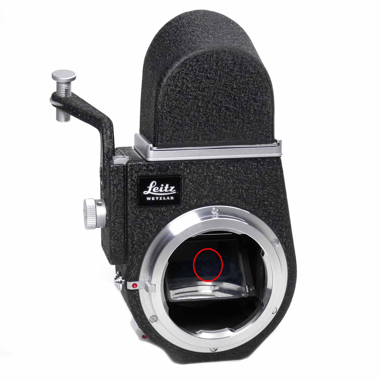 -Der Visoflex III ist in gutem Zustand. Auf dem Spiegel hat es einige Reinigungsspuren. Das Sucherbild ist gleichwohl scharf und lichtstark. Der Auslöser und die Anhebung des Spiegels funktionieren einwandfrei. In der 4x Lupe hat es ein wenig Staubeinschluss und auf der Glasfläche Reinigungsspuren. Auf den Fotos rot markiert.