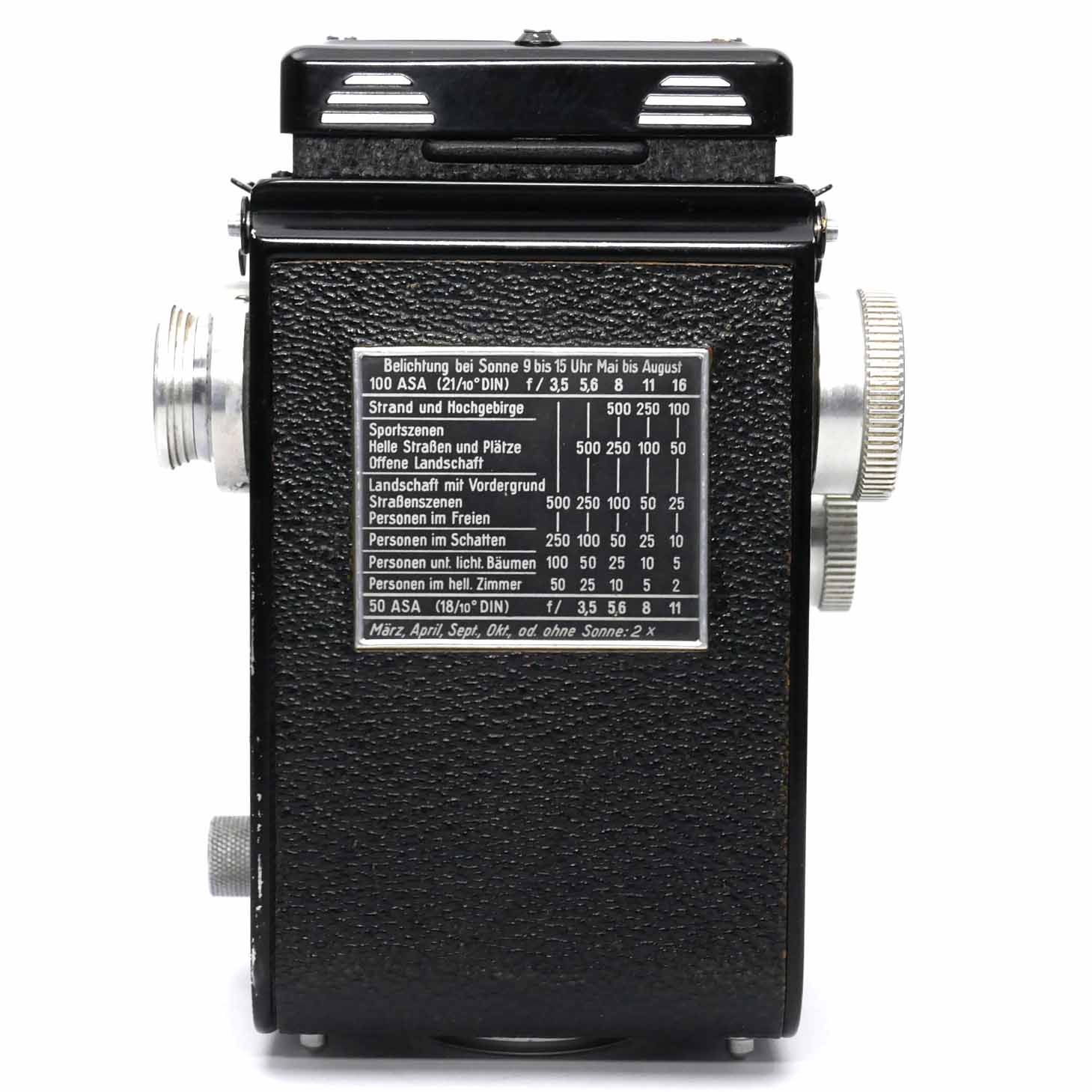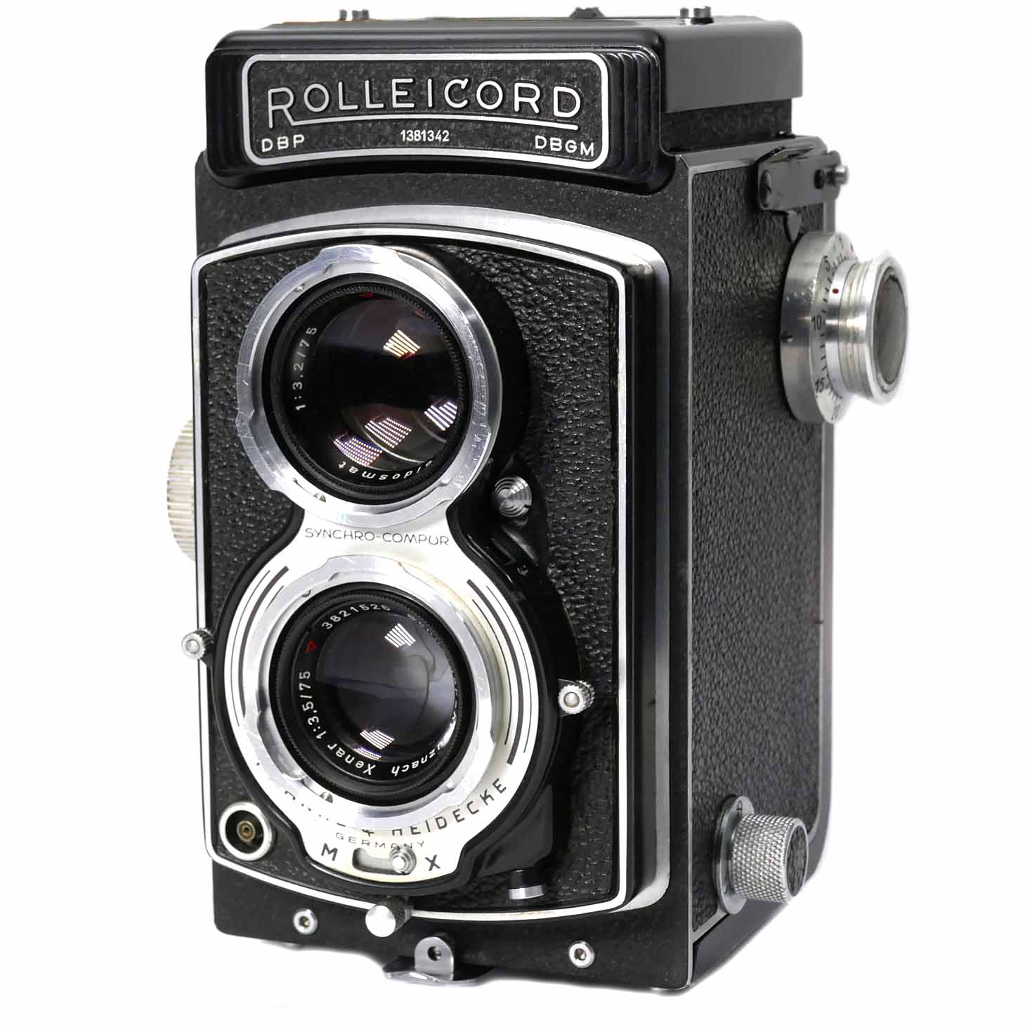 Diese Rolleicord IV (No.1361342) ist mit einem Schneider Kreuznach Xenar 3.5/75mm ausgerüstet. Die Kamera wurde im Dezember 2025 revidiert. Das Gehäuse hat nur wenig Gebrauchsspuren. Der Schachtsucher springt leicht auf und die Lupe hat keine Reinigungsspuren in der Vergütung. Auch die Umstellung auf den Sportsucher funktioniert gut. Die Rückwand verriegelt einwandfrei, die Kamera ist lichtdicht. Die Filmandruckplatte zeigt keine Abnützung. Alle Verschlusszeiten von B und 1 sec. bis 1/500c sec. laufen nach der Revision präzise ab. Die Hebel zum einstellen von Zeit und Blende oder drehen fein. Die Blenden- und Verschlusslamellen wurden gereinigt. Die Sucher- und Aufnahmeoptik sind klar und ohne Fungus, Trübung, Kratzer oder Vergütungsschäden. Die Mattscheibe hat keine Reinigungsspuren. Auch Scharfeinstellung und der Filmtransport laufen fein. Die Doppelbelichtungssperre funktioniert.