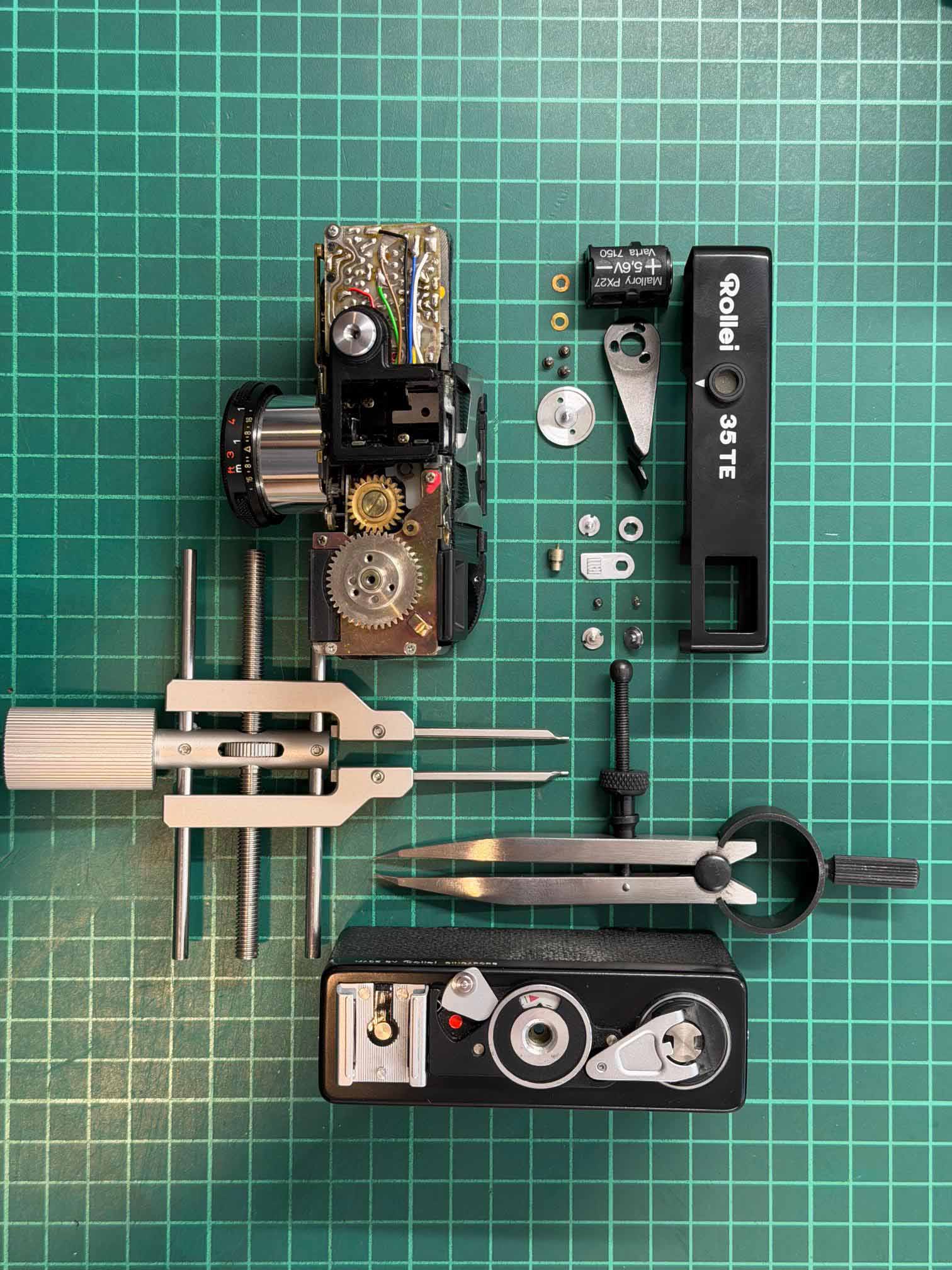 Diese Rollei 35TE mit der No.604470145 ist in einem Topzustand. Laut Rollei Code wurde dieses Exemplar 1981 hergestellt. Die Rollei 35 TE wurde im März 2026 revidiert. (Aufnahme der REvision bei den Bildern) Das schwarze Gehäuse hat keine Dellen es sind nur wenig Gebrauchsspuren sichtbar. Die Blendenlamellen sind sauber und die Distanzeinstellung dreht fein. Alle Verschlusszeiten stimmen nach der Revision genau. Da die Quecksilber PX-27 Zelle mit 5.6V nicht mehr hergestellt wird, liegt ein Adapter mit 4 Energizer 386 bei. Der Belichtungsmesser stimmt genau. Das Rollei Tessar 3.5/ 40 mm ist klar und ohne Staubeinschluss, Vergütungsschäden oder Kratzer. Auf dem ausziehbaren Tubus sieht man keine Kratzer.