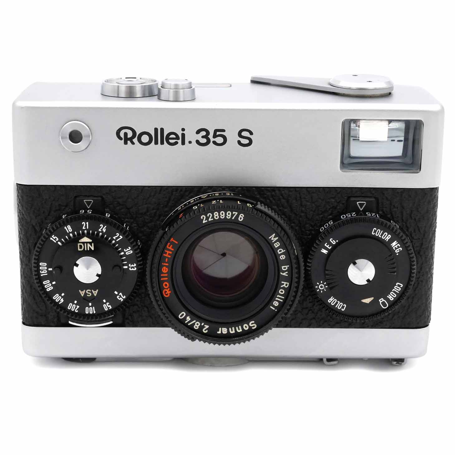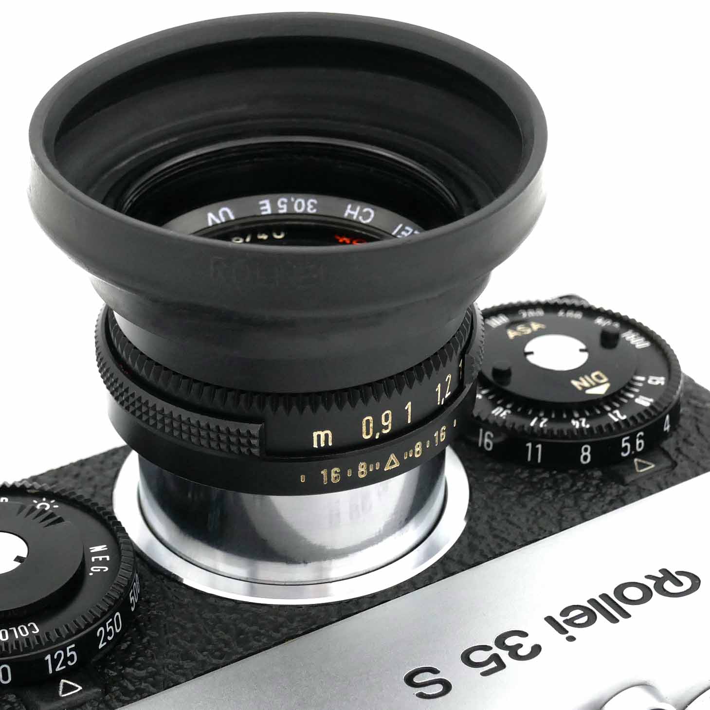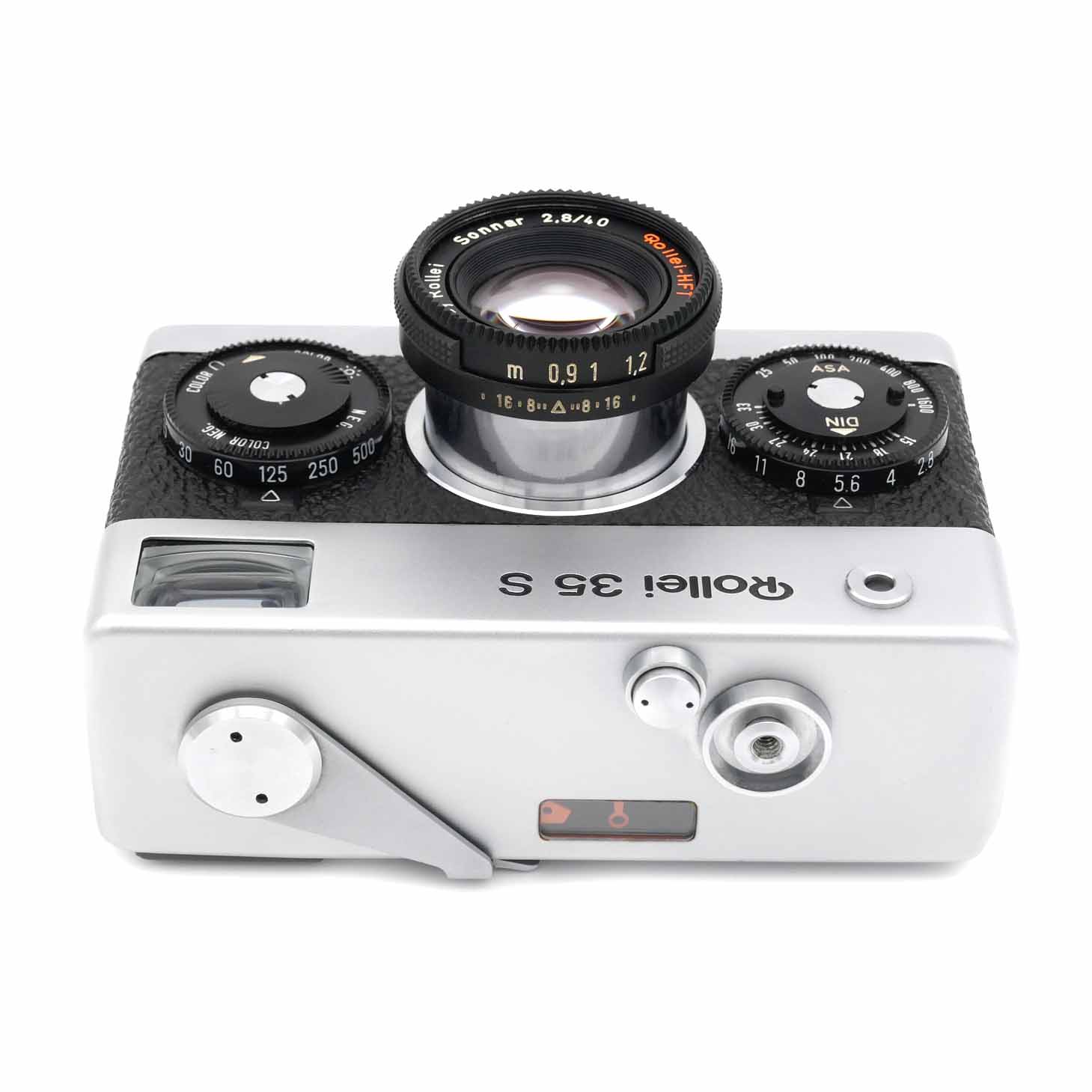 Diese Rollei 35S chrome wurde im März 2026 revidiert. Die Kamera ist in einem guten Zustand. Es hat ein paar Gebrauchsspuren, Druckstellen und Abrieb am Gehäuse. (Bilder) Die Rollei 35S Sucherkamera wurde von 1974 bis 1980 hergestellt. Das Rollei HFT Sonnar 2.8/40 mm (2289976) Objektiv ist klar und frei von Kratzer oder Vergütungsschäden. Die Blenden- und Verschlusslamellen sind ohne Fett. Der Belichtungsmesser stimmt nach der Revision und der Anpassung auf die 1.5 Volt Batterie genau. Der Scharfeinstellring und die Räder für die Verschlusszeit- und Blendeneinstellung drehen ohne Widerstand. Die Blendenlamellen zeigen keinen Abrieb. Der Sucher ist klar und die Bildbegrenzungslinien kontrastreich.