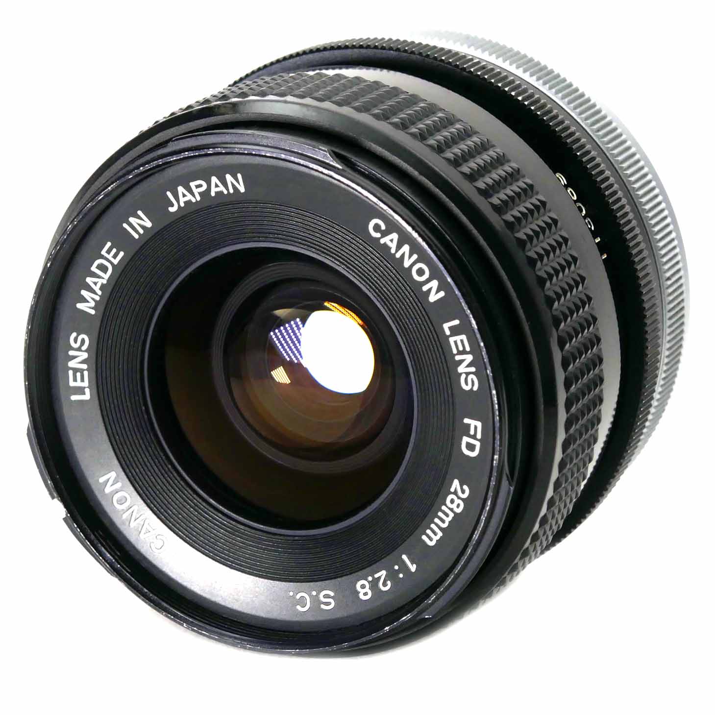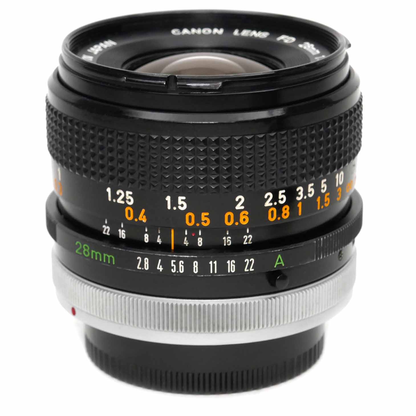 Das Canon FD 28mm / 2.8 S.C. (113089) ist in sehr gutem Zustand. Die Linsen sind klar ohne Vergütungsschäden oder Kratzer. Der Fokusring lässt sich leicht drehen. Die Blendenlamellen sind nicht fettig und weisen nur wenig Abnutzungserscheinungen auf. Die Blendenmechanik schliesst schnell. Der Objektivtubus und der Bajonettanschluss haben nur wenig Gebrauchsspuren.