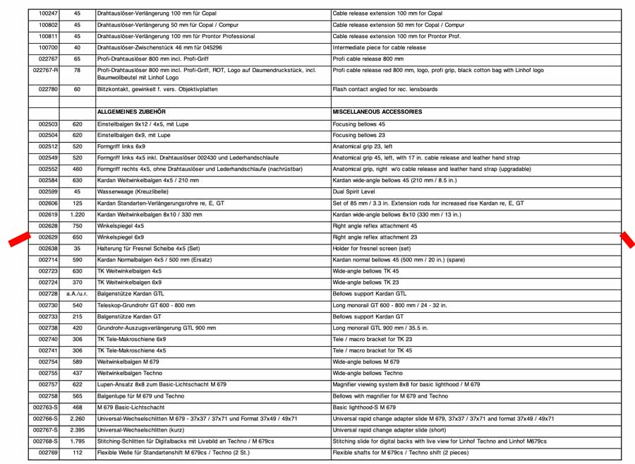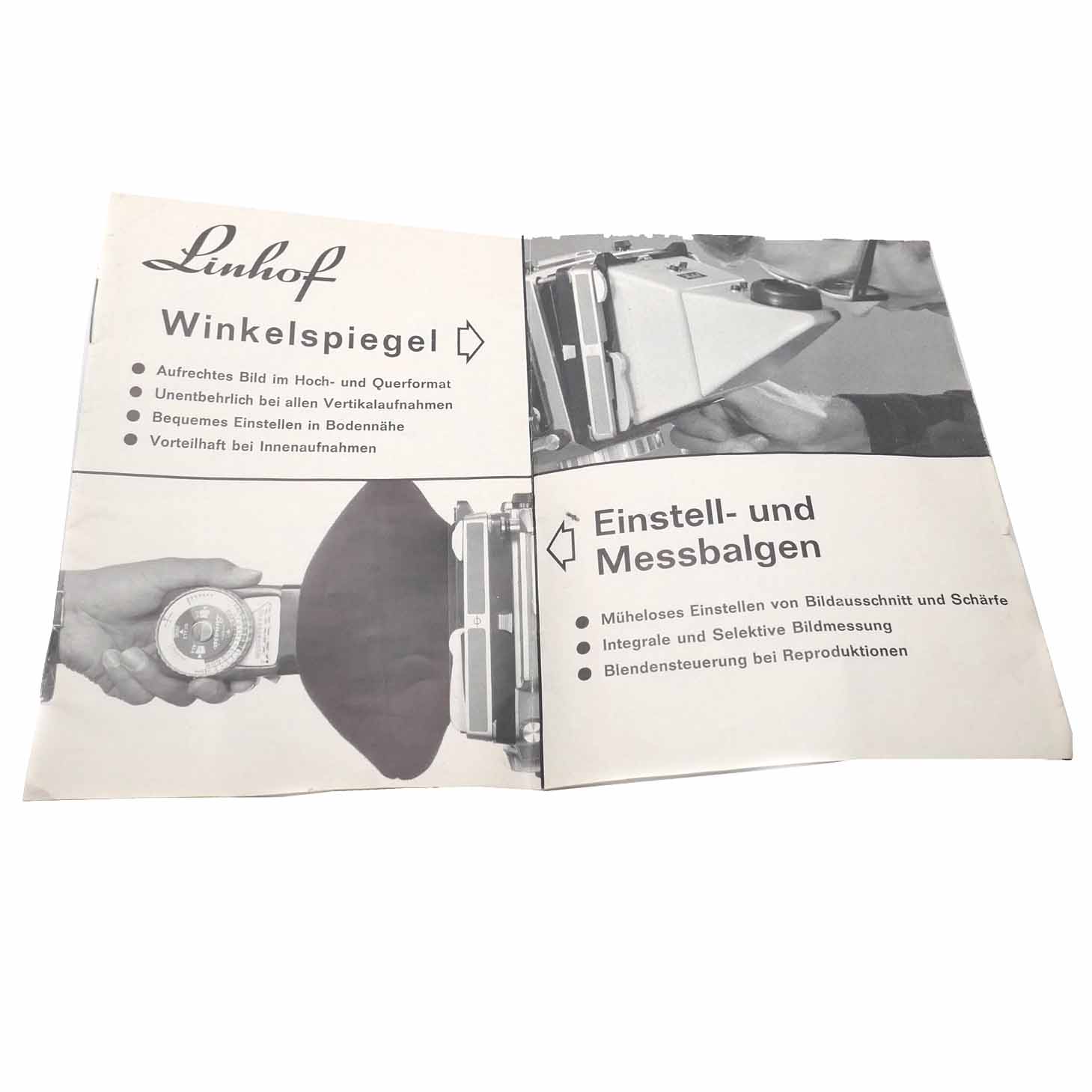 -7-seitige Bedienungsanleitung zum Linhof Winkelspiegel und Linhof Einstell- und Messbalgen in deutscher Sprache