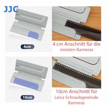 Der JJC FHC-1-Filmanschneider wurde speziell für 135-Filme entwickelt. Sie können damit ein Filmstück des 35 mm Films in einen 10 cm oder 4 cm langen Anschnitt zuschneiden. Für die Leica Schraubgewinde Kameras der Leica I, Leica II und Leica III Serie muss der Anschnitt auf 10 cm verlängert werden. Das Risiko besteht sonst, dass der Film reisst und der Verschluss beschädigt wird. Die scharfe Klinge aus rostfreiem Stahl schneidet den Filmanschnitt schnell und präzise. Mit einer Länge von 8.5cm, der von Breite 4,5 cm und einer Höhe von 2,5 cm ist der JJC Filmanschneider sehr handlich.