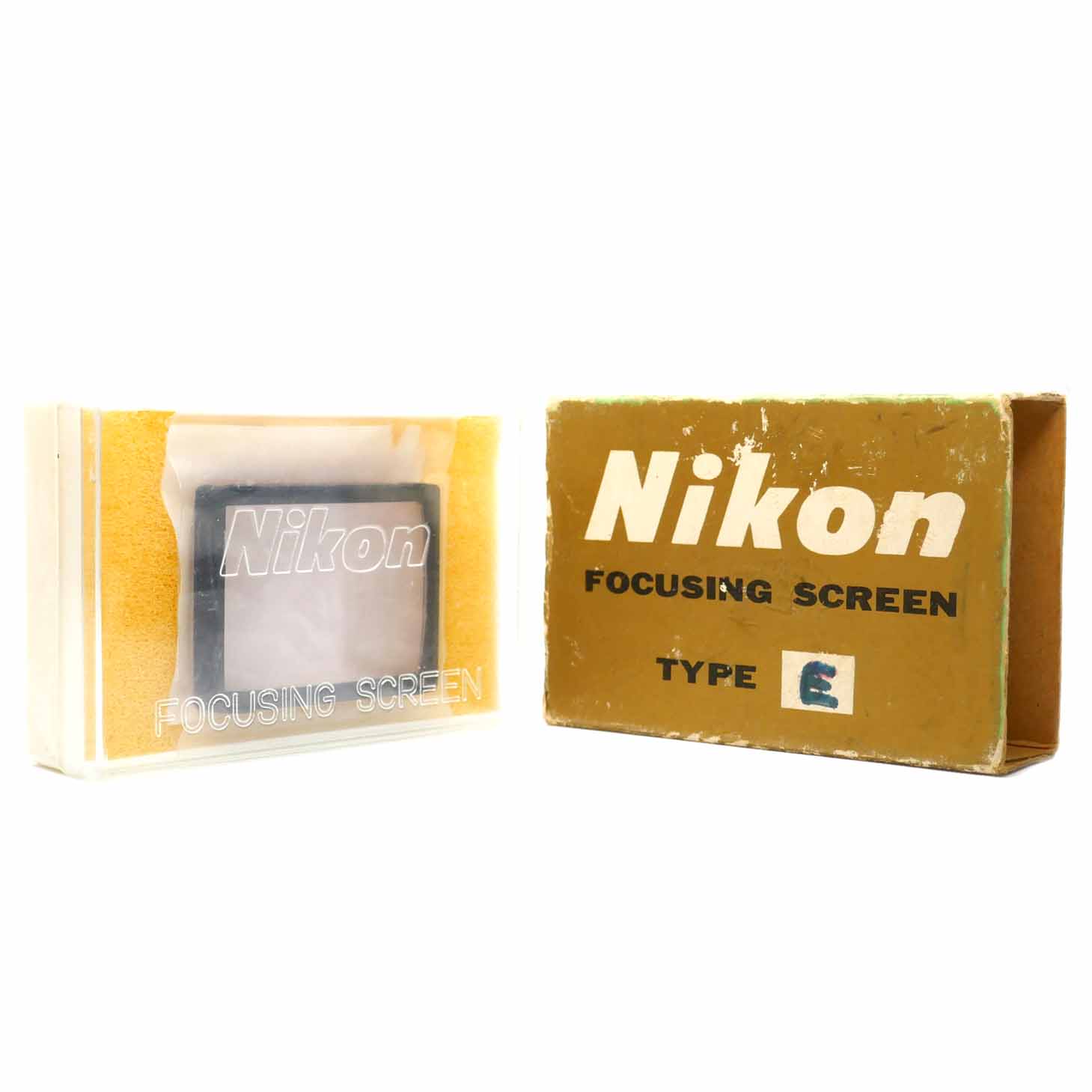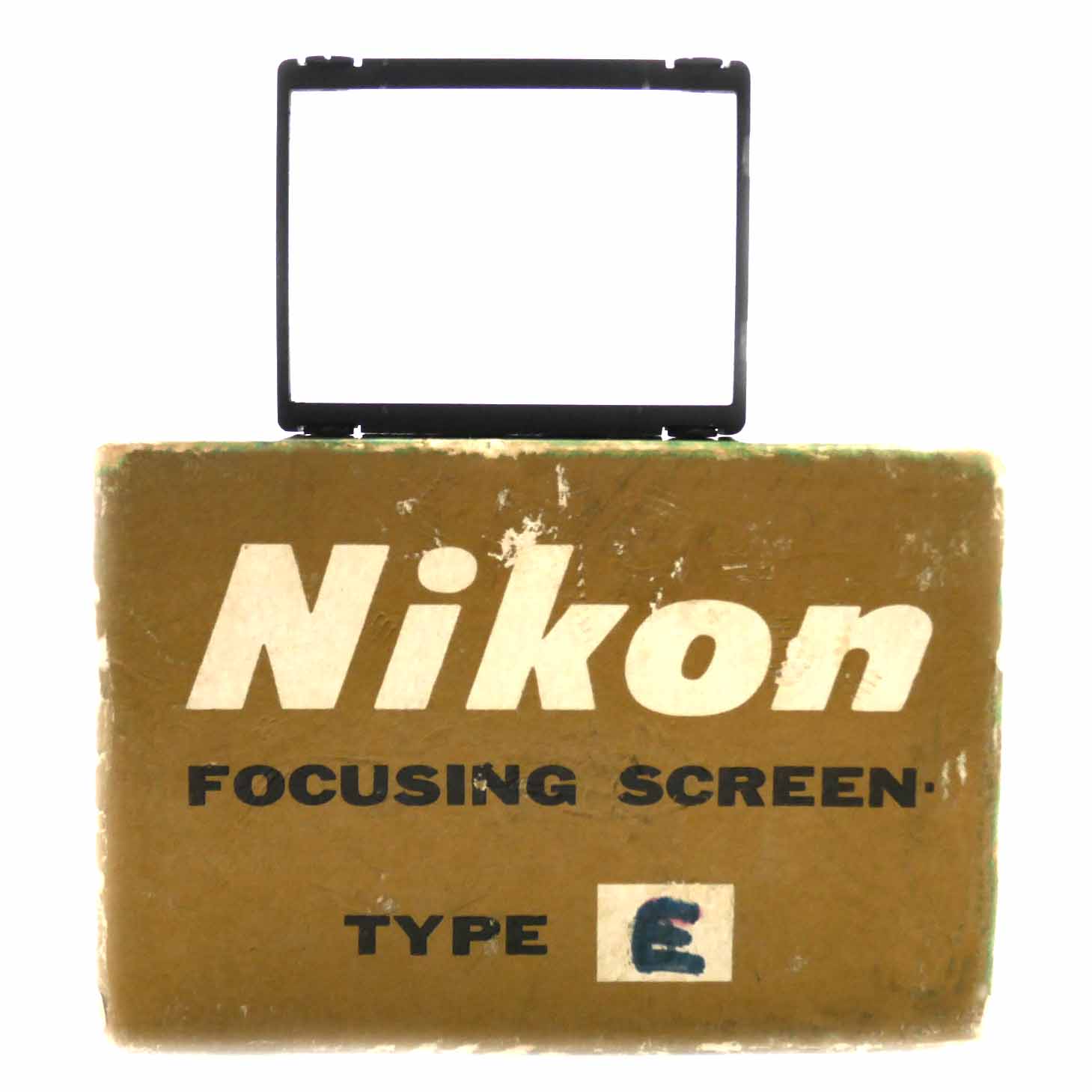 Die Nikon Mattscheibe E mit Gitterlinien weist nur wenige Gebrauchsspuren und befindet sich in der Originalverpackung. Die rote Beschriftung weist darauf hin, dass diese Mattscheibe E mit den Kameras Nikon F und Nikon F2 kompatibel ist. Unter dem folgenden Link finden Sie eine Liste der kompatiblen Objektive. Die Einstellscheibe hat ein wenig Gebrauchsspuren auf dem Rahmen. Auf den Gläsern sind keine Reinigungsspuren zu sehen.